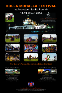 The 16 March, 2014, third day of the tournament, began at 3 p.m. as a huge crowd, dignitaries, guests, special invitees and the media waited with bated breath to watch the first polo tournament ever held in Sri Anandpur Sahib coinciding with Holla Mohalla celebrations. The participating teams were British Airways/ Sri Anandpur Sahib Polo Team (Blue) and Hyatt Regency- Ludhiana/ Delhi Polo Team (Saffron). The players of the Blue team were Sachin Sarbalia, Raghav Rao and Vikram Singh Sodhi (Captain). The players of the Saffron team were Prateesh Agarwal, Deepak Udhar and Amit Sangwan (Captain). Veteran polo player and serving Maj. General Balbir Singh Sandhu umpired the game. The game began with the Blue team having the upper hand as they set the score board rolling. In a close fight, the two teams displayed the spirit of fight to finish that kept the audience, even the uninitiated, entertained and drawn into an excitement where they were totally involved with the game. As the game galloped into its final chukker, the Saffron team just managed to tip the scale in the last dying seconds by scoring a goal to win the match. The score was Blue-8 and Saffron 9 goals. Patron, Shri Madan Mohan Mittal, Minister for Industry, Govt of Punjab gave away the mementoes to the runner up team, umpire, compere and the trophy to the winning team.