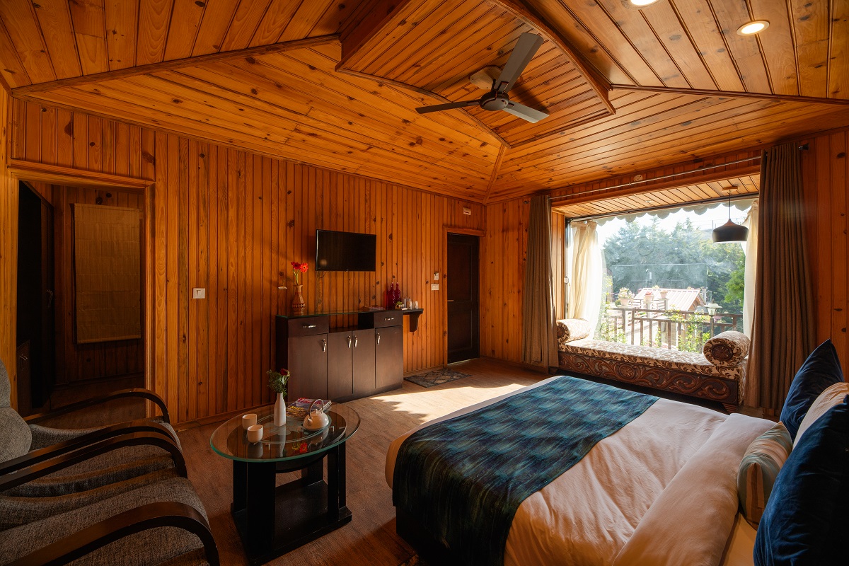 Deluxe Room at Ojaswi Resort Mukteshwar featuring warm wooden interiors and peaceful garden-facing views.